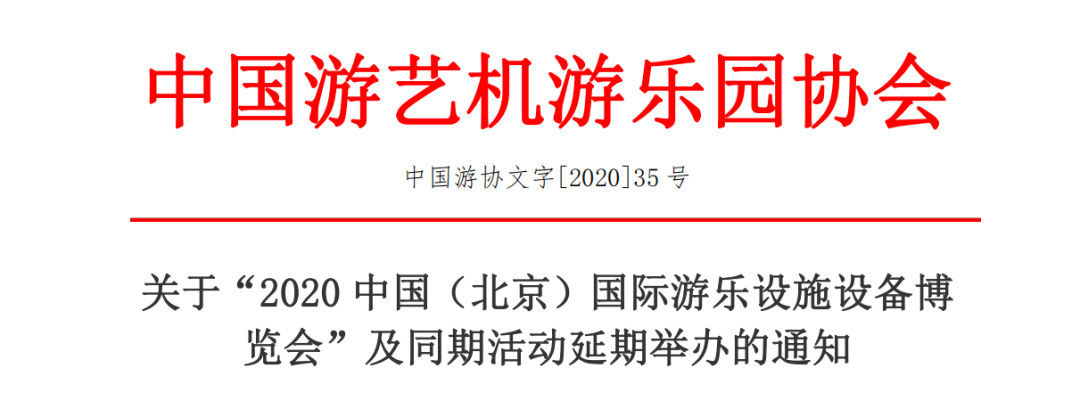 鑒于6月11日北京市突發(fā)新增新冠肺炎病例,應(yīng)北京市政府防疫要求,為確保展商及觀眾的健康安全,中國游藝機(jī)游樂園協(xié)會(huì)決定將原定于6月22日-6月24 日舉辦的“2020中國(北京)國際游樂設(shè)施設(shè)備博覽會(huì)”及同期活動(dòng)延期舉辦。