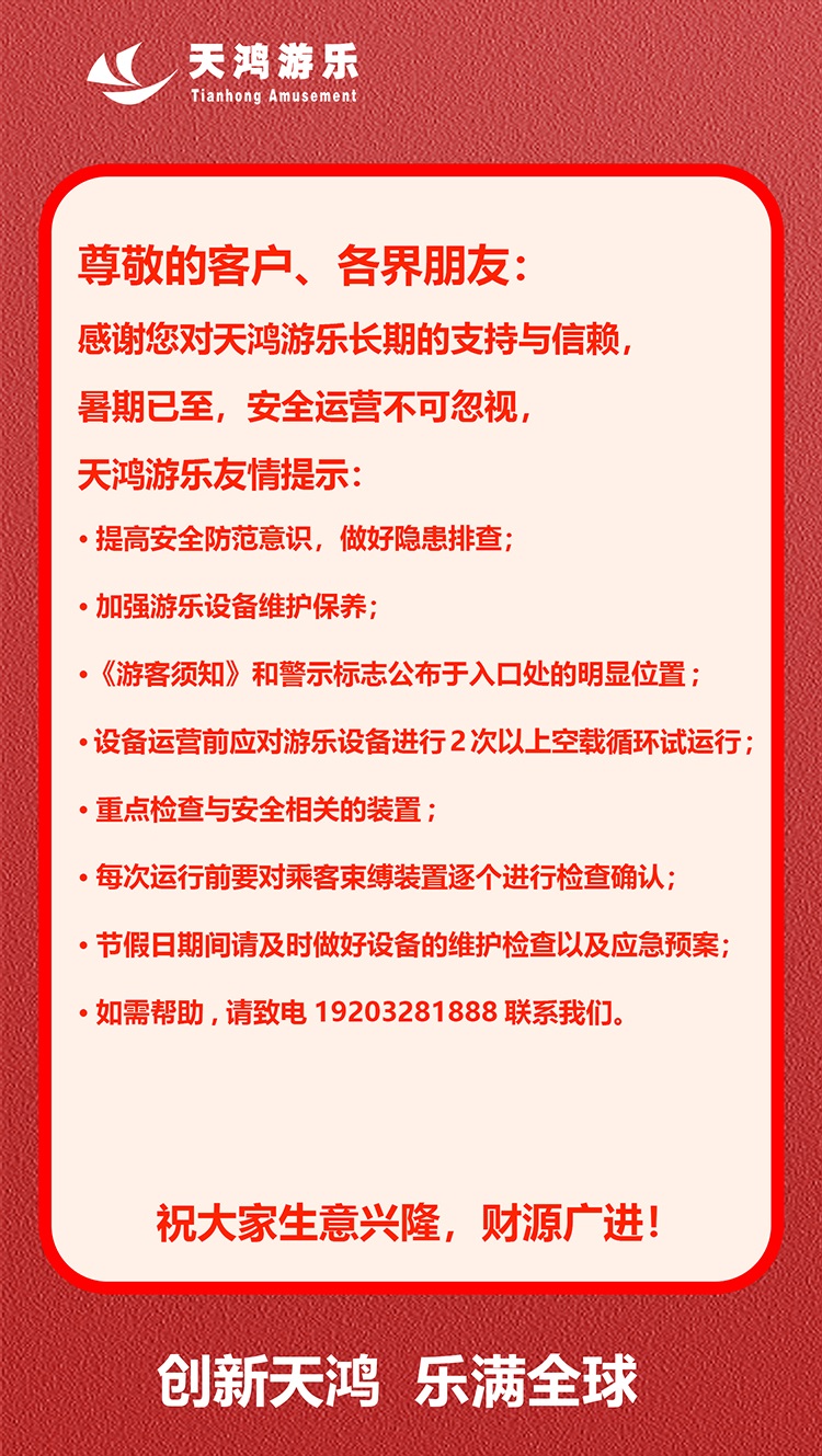 暑期游樂設(shè)施安全運營提示 發(fā)布日期:2024-7-15 作者:tianhong